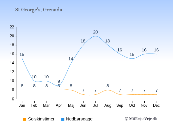 Graferne viser det gennemsnitlige antal solskinstimer i St George's pr. dag samt det gennemsnitlige antal dage med nedbør i St George's sammenlignet med København.