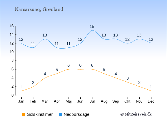 Grafen viser antallet af solskinstimer i Narsarsuaq (d.v.s. det gennemsnitlige antal timer pr. dag hvor solen skinner), samt antallet af nedbørsdage (d.v.s. det gennemsnitlige antal dage i en given måned,