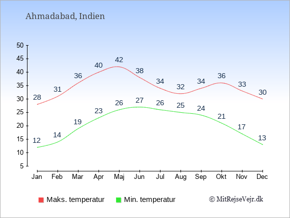 Graferne viser de gennemsnitlige maksimale temperaturer i Ahmadabad og København (typisk når solen står højest på himmelen om eftermiddagen) og de gennemsnitlige minimale temperaturer (typisk den laveste temperatur som måles om natten).