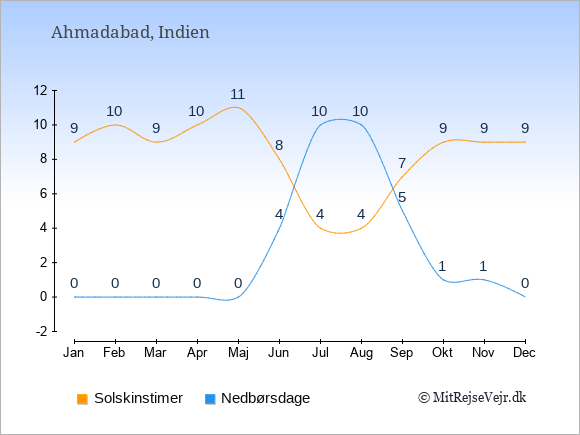 Graferne viser det gennemsnitlige antal solskinstimer i Ahmadabad pr. dag samt det gennemsnitlige antal dage med nedbør i Ahmadabad sammenlignet med København.