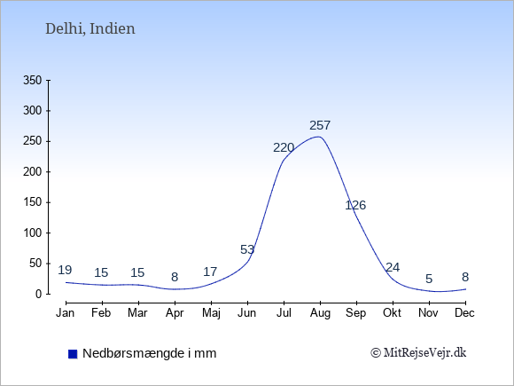 Se klimadata for Delhi sammenlignet med klimaet i Danmark.