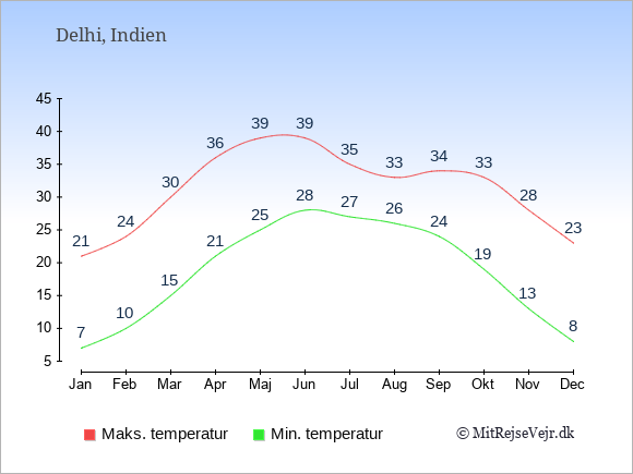 Graferne viser de gennemsnitlige maksimale temperaturer i Delhi og København (typisk når solen står højest på himmelen om eftermiddagen) og de gennemsnitlige minimale temperaturer (typisk den laveste temperatur som måles om natten).