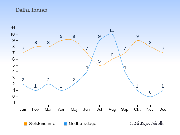 Graferne viser det gennemsnitlige antal solskinstimer i Delhi pr. dag samt det gennemsnitlige antal dage med nedbør i Delhi sammenlignet med København.