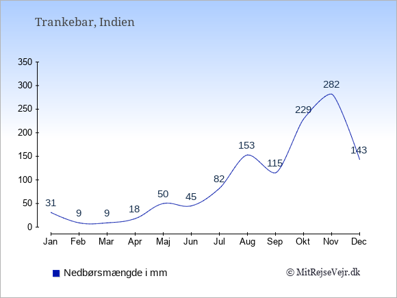 Vejret i Trankebar er som regel bedst i de måneder, hvor der er mange solskinstimer og få nedbørsdage.