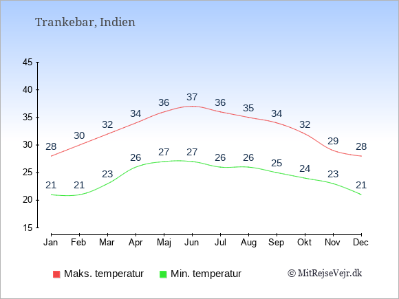 Grafen viser de gennemsnitlige maksimale temperaturer i Trankebar (som oftest den værdi, der er målt midt på dagen) og de gennemsnitlige minimale temperaturer (som oftest den værdi, der er målt midt om natten).