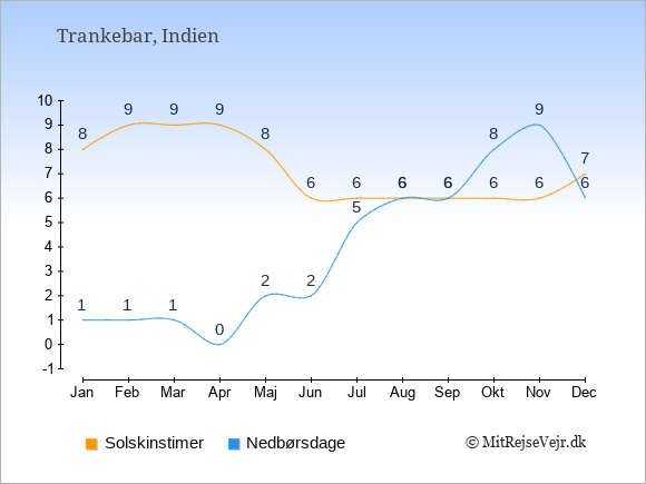 Vejret i Trankebar: Solskinstimer og nedbørsdage