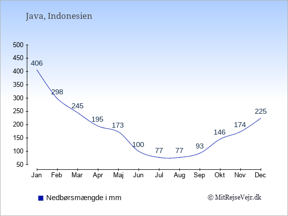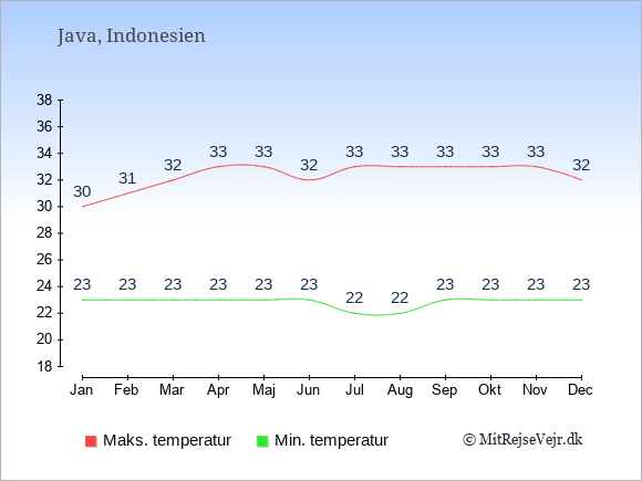 Her på siden kan du få et samlet overblik over det gennemsnitlige klima på Java måned for måned sammenlignet med klimaet i København. Oplysningerne om det historiske klima kan du bruge til at planlægge din ferie og finde det bedste tidspunkt at rejse til Java på.