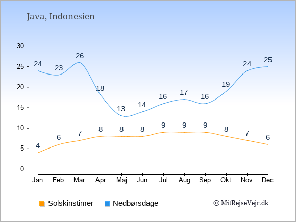 Skal man ud og rejse, har Java det bedste klima i de måneder, hvor der er mange solskinstimer og få nedbørsdage.