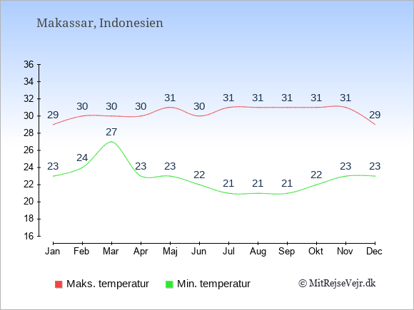 Graferne viser de gennemsnitlige maksimale temperaturer i Makassar og København (typisk når solen står højest på himmelen om eftermiddagen) og de gennemsnitlige minimale temperaturer (typisk den laveste temperatur som måles om natten).