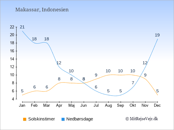 Graferne viser det gennemsnitlige antal solskinstimer i Makassar pr. dag samt det gennemsnitlige antal dage med nedbør i Makassar sammenlignet med København.