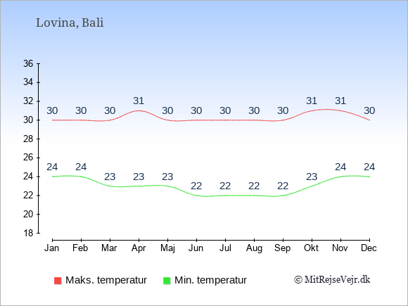 Grafen viser de gennemsnitlige maksimale temperaturer i Lovina (som oftest den værdi, der er målt midt på dagen) og de gennemsnitlige minimale temperaturer (som oftest den værdi, der er målt midt om natten).