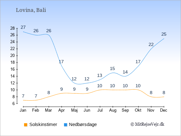 Grafen viser antallet af solskinstimer i Lovina (d.v.s. det gennemsnitlige antal timer pr. dag hvor solen skinner), samt antallet af nedbørsdage (d.v.s. det gennemsnitlige antal dage i en given måned,