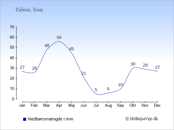 Her på siden kan du få et samlet overblik over det gennemsnitlige klima i Tabriz måned for måned sammenlignet med klimaet i København. Oplysningerne om det historiske klima kan du bruge til at planlægge din ferie og finde det bedste tidspunkt at rejse til Tabriz på.