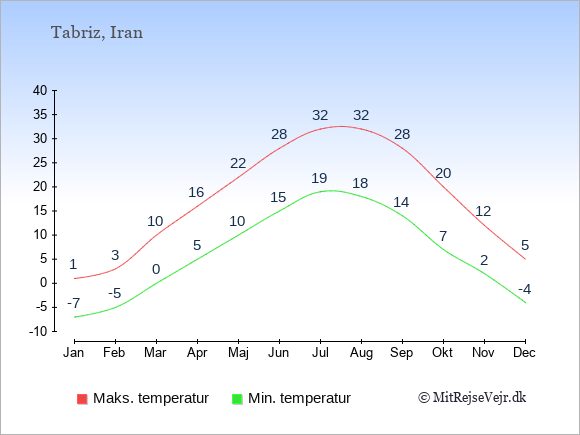 Graferne viser de gennemsnitlige maksimale temperaturer i Tabriz og København (typisk når solen står højest på himmelen om eftermiddagen) og de gennemsnitlige minimale temperaturer (typisk den laveste temperatur som måles om natten).