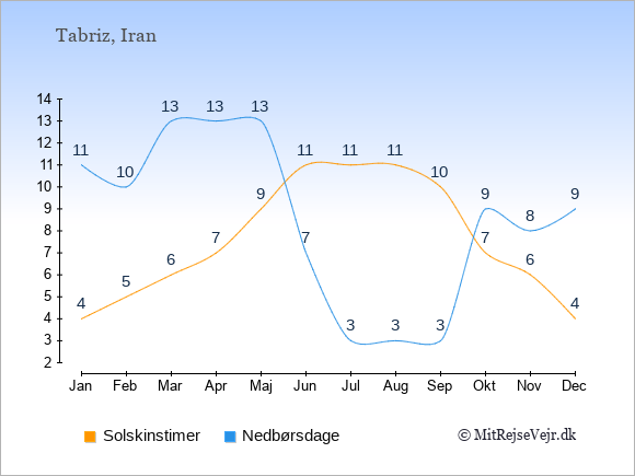 Graferne viser det gennemsnitlige antal solskinstimer i Tabriz pr. dag samt det gennemsnitlige antal dage med nedbør i Tabriz sammenlignet med København.