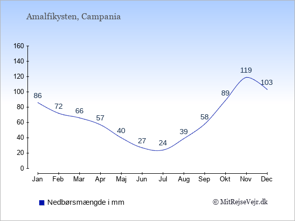 Skal man ud og rejse, har Amalfikysten det bedste klima i de måneder, hvor der er mange solskinstimer og få nedbørsdage.
