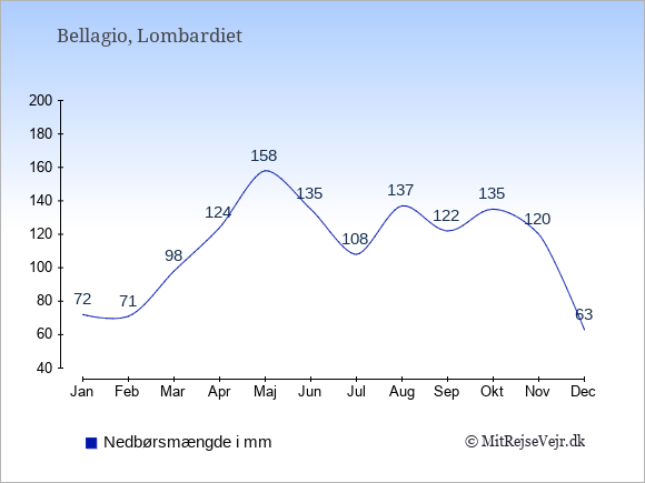 Skal man ud og rejse, har Bellagio det bedste klima i de måneder, hvor der er mange solskinstimer og få nedbørsdage.