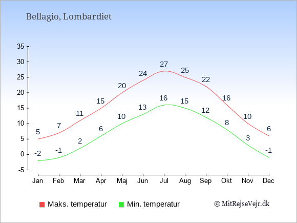 Graferne viser de gennemsnitlige maksimale temperaturer i Bellagio og København (typisk når solen står højest på himmelen om eftermiddagen) og de gennemsnitlige minimale temperaturer (typisk den laveste temperatur som måles om natten).
