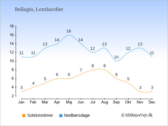 Graferne viser det gennemsnitlige antal solskinstimer i Bellagio pr. dag samt det gennemsnitlige antal dage med nedbør i Bellagio sammenlignet med København.