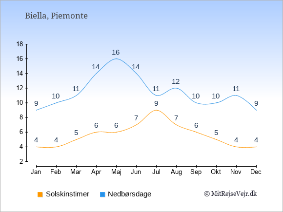 Graferne viser det gennemsnitlige antal solskinstimer i Biella pr. dag samt det gennemsnitlige antal dage med nedbør i Biella sammenlignet med København.