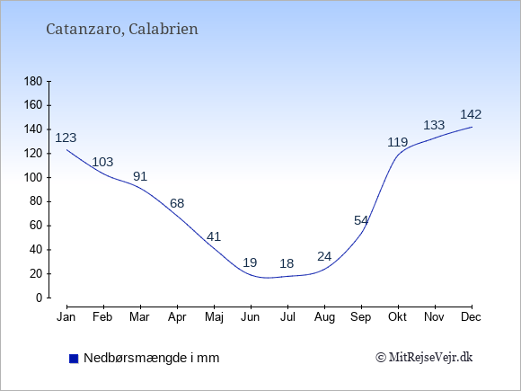 Se klimadata for Catanzaro sammenlignet med klimaet i Danmark.