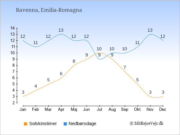 Graferne viser det gennemsnitlige antal solskinstimer i Ravenna pr. dag samt det gennemsnitlige antal dage med nedbør i Ravenna sammenlignet med København.