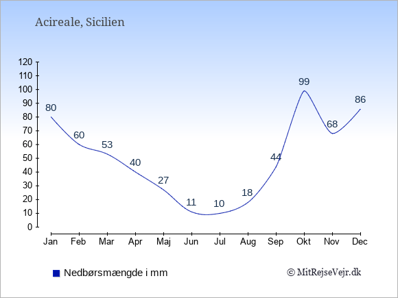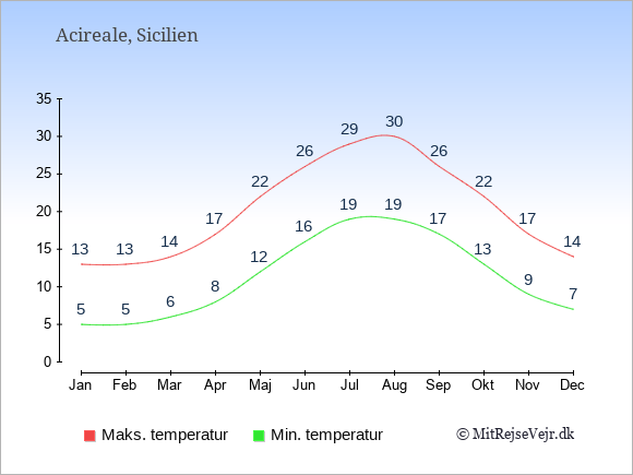 Grafen viser de gennemsnitlige maksimale temperaturer i Acireale (som oftest den værdi, der er målt midt på dagen) og de gennemsnitlige minimale temperaturer (som oftest den værdi, der er målt midt om natten).