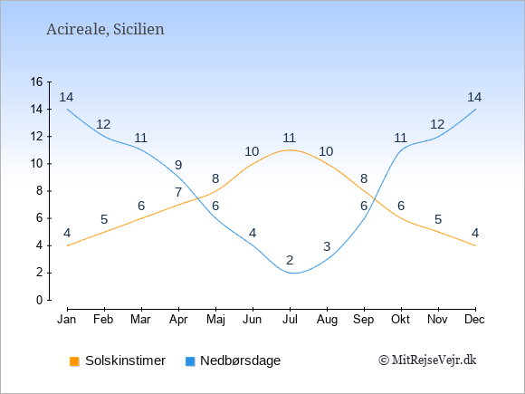 Grafen viser antallet af solskinstimer i Acireale (d.v.s. det gennemsnitlige antal timer pr. dag hvor solen skinner), samt antallet af nedbørsdage (d.v.s. det gennemsnitlige antal dage i en given måned,
