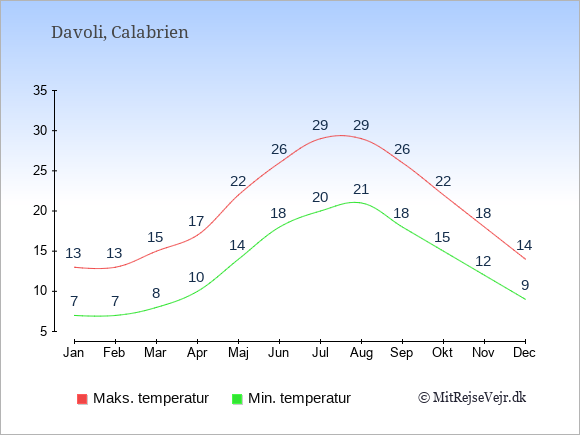 Grafen viser de gennemsnitlige maksimale temperaturer i Davoli (som oftest den værdi, der er målt midt på dagen) og de gennemsnitlige minimale temperaturer (som oftest den værdi, der er målt midt om natten).