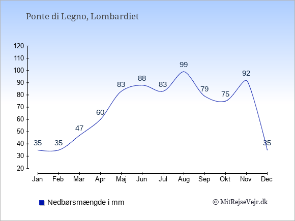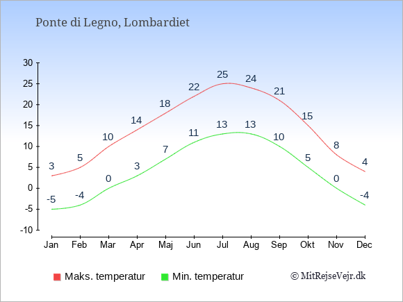 Grafen viser de gennemsnitlige maksimale temperaturer i Ponte di Legno (som oftest den værdi, der er målt midt på dagen) og de gennemsnitlige minimale temperaturer (som oftest den værdi, der er målt midt om natten).