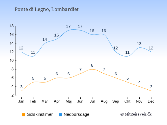Grafen viser antallet af solskinstimer i Ponte di Legno (d.v.s. det gennemsnitlige antal timer pr. dag hvor solen skinner), samt antallet af nedbørsdage (d.v.s. det gennemsnitlige antal dage i en given måned,