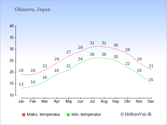 Graferne viser de gennemsnitlige maksimale temperaturer på Okinawa og i København (typisk når solen står højest på himmelen om eftermiddagen) og de gennemsnitlige minimale temperaturer (typisk den laveste temperatur som måles om natten).
