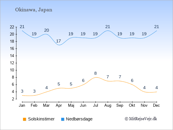 Graferne viser det gennemsnitlige antal solskinstimer på Okinawa pr. dag samt det gennemsnitlige antal dage med nedbør på Okinawa sammenlignet med København.