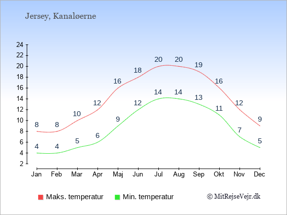 Grafen viser de gennemsnitlige maksimale temperaturer på Jersey (som oftest den værdi, der er målt midt på dagen) og de gennemsnitlige minimale temperaturer (som oftest den værdi, der er målt midt om natten).
