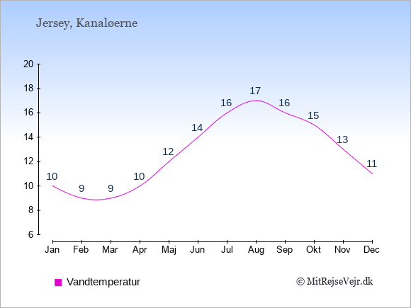 Du kan også se vejrudsigten for Jersey med den aktuelle vandtemperatur her: Vejrudsigt Jersey, vejret lige nu.