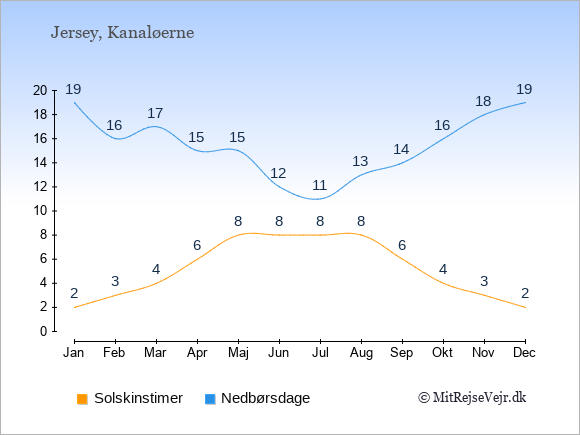 Grafen viser antallet af solskinstimer på Jersey (d.v.s. det gennemsnitlige antal timer pr. dag hvor solen skinner), samt antallet af nedbørsdage (d.v.s. det gennemsnitlige antal dage i en given måned,