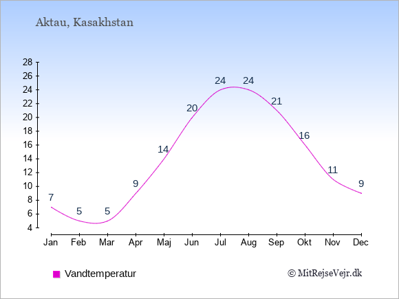 Hvis du vil se, hvordan vejret i Aktau adskiller sig fra vejret derhjemme, kan du sammenligne tallene måned for måned med de tilsvarende tal for Danmark under Aktau: klima & vejr.