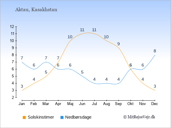Grafen viser antallet af solskinstimer i Aktau (d.v.s. det gennemsnitlige antal timer pr. dag hvor solen skinner), samt antallet af nedbørsdage (d.v.s. det gennemsnitlige antal dage i en given måned,