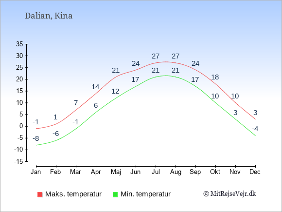 Graferne viser de gennemsnitlige maksimale temperaturer i Dalian og København (typisk når solen står højest på himmelen om eftermiddagen) og de gennemsnitlige minimale temperaturer (typisk den laveste temperatur som måles om natten).