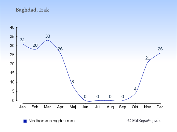 Her på siden kan du få et samlet overblik over det gennemsnitlige klima i Irak måned for måned sammenlignet med klimaet i København. Oplysningerne om det historiske klima kan du bruge til at planlægge din ferie og finde det bedste tidspunkt at rejse til Irak på.