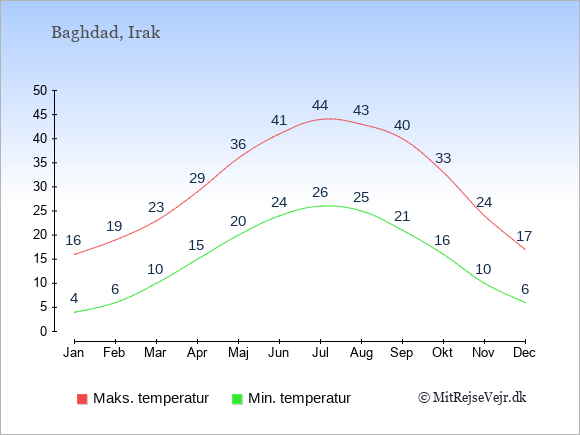 Graferne viser de gennemsnitlige maksimale temperaturer i Irak og København (typisk når solen står højest på himmelen om eftermiddagen) og de gennemsnitlige minimale temperaturer (typisk den laveste temperatur som måles om natten).