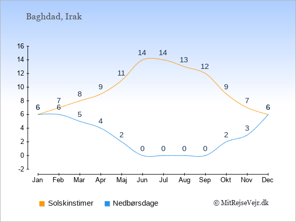 Graferne viser det gennemsnitlige antal solskinstimer i Baghdad pr. dag samt det gennemsnitlige antal dage med nedbør i Baghdad sammenlignet med København.