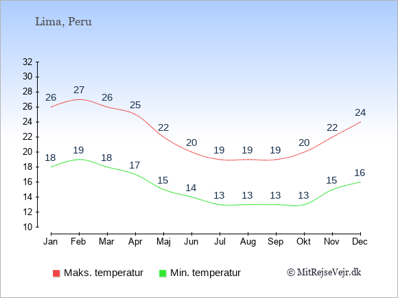 Graferne viser de gennemsnitlige maksimale temperaturer i Peru og København (typisk når solen står højest på himmelen om eftermiddagen) og de gennemsnitlige minimale temperaturer (typisk den laveste temperatur som måles om natten).