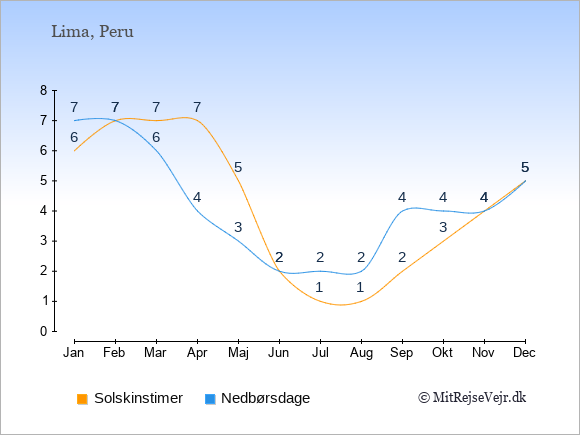 Graferne viser det gennemsnitlige antal solskinstimer i Lima pr. dag samt det gennemsnitlige antal dage med nedbør i Lima sammenlignet med København.