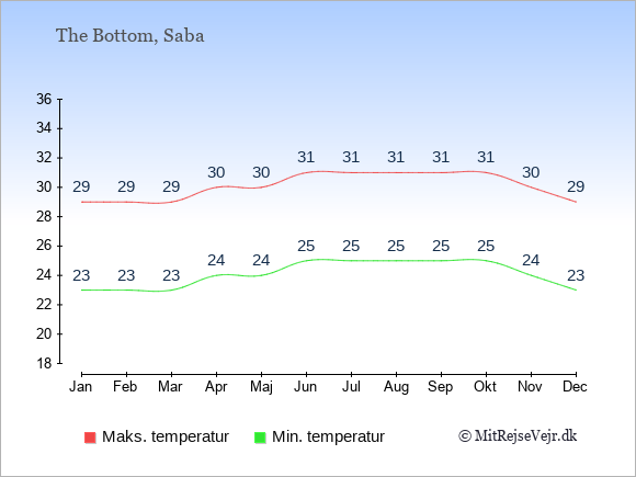 Graferne viser de gennemsnitlige maksimale temperaturer på Saba og København (typisk når solen står højest på himmelen om eftermiddagen) og de gennemsnitlige minimale temperaturer (typisk den laveste temperatur som måles om natten).