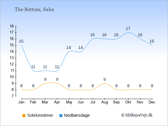 Graferne viser det gennemsnitlige antal solskinstimer i The Bottom pr. dag samt det gennemsnitlige antal dage med nedbør i The Bottom sammenlignet med København.