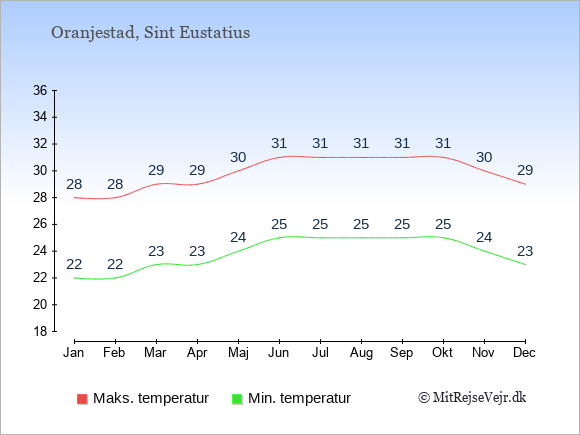 Graferne viser de gennemsnitlige maksimale temperaturer på Sint Eustatius og København (typisk når solen står højest på himmelen om eftermiddagen) og de gennemsnitlige minimale temperaturer (typisk den laveste temperatur som måles om natten).