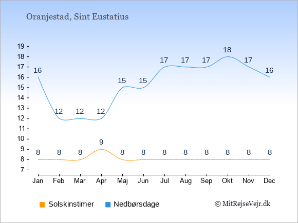 Graferne viser det gennemsnitlige antal solskinstimer i Oranjestad pr. dag samt det gennemsnitlige antal dage med nedbør i Oranjestad sammenlignet med København.
