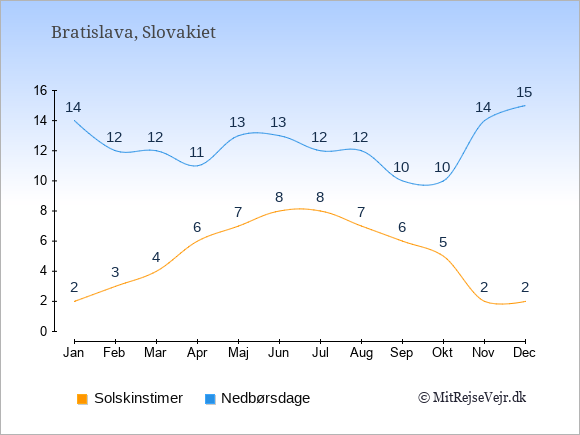 Graferne viser det gennemsnitlige antal solskinstimer i Bratislava pr. dag samt det gennemsnitlige antal dage med nedbør i Bratislava sammenlignet med København.