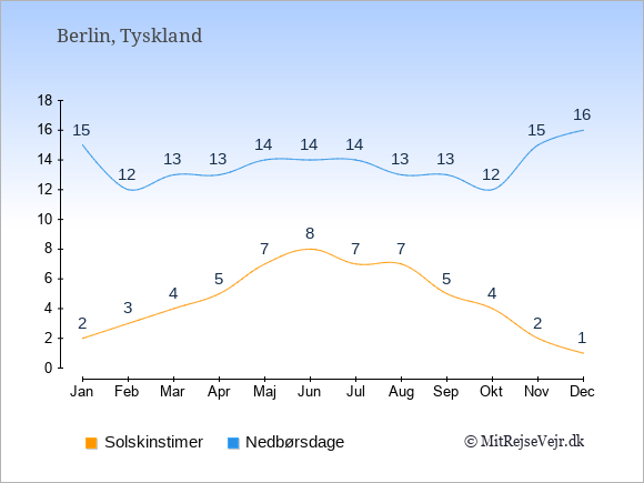 Graferne viser det gennemsnitlige antal solskinstimer i Berlin pr. dag samt det gennemsnitlige antal dage med nedbør i Berlin sammenlignet med København.